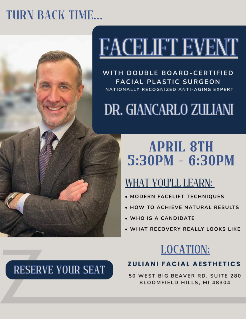 We would love to discuss your goals and begin working toward a more beautiful, refined, and confident you. Please give our office a call at 248.322.3362 or use the form to request a consultation with Dr. Zuliani at Zuliani Facial Aesthetics in Bloomfield Hills.